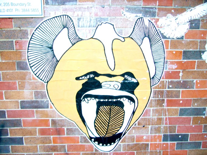 Very striking street art that went up on Boundary St. recently. It’s done on paper and glued to the wall. I believe the cool kids call that a “paste up”. It looks like an angry koala. You can’t tell from this photo, but it’s nose is glittery. I’m impressed.