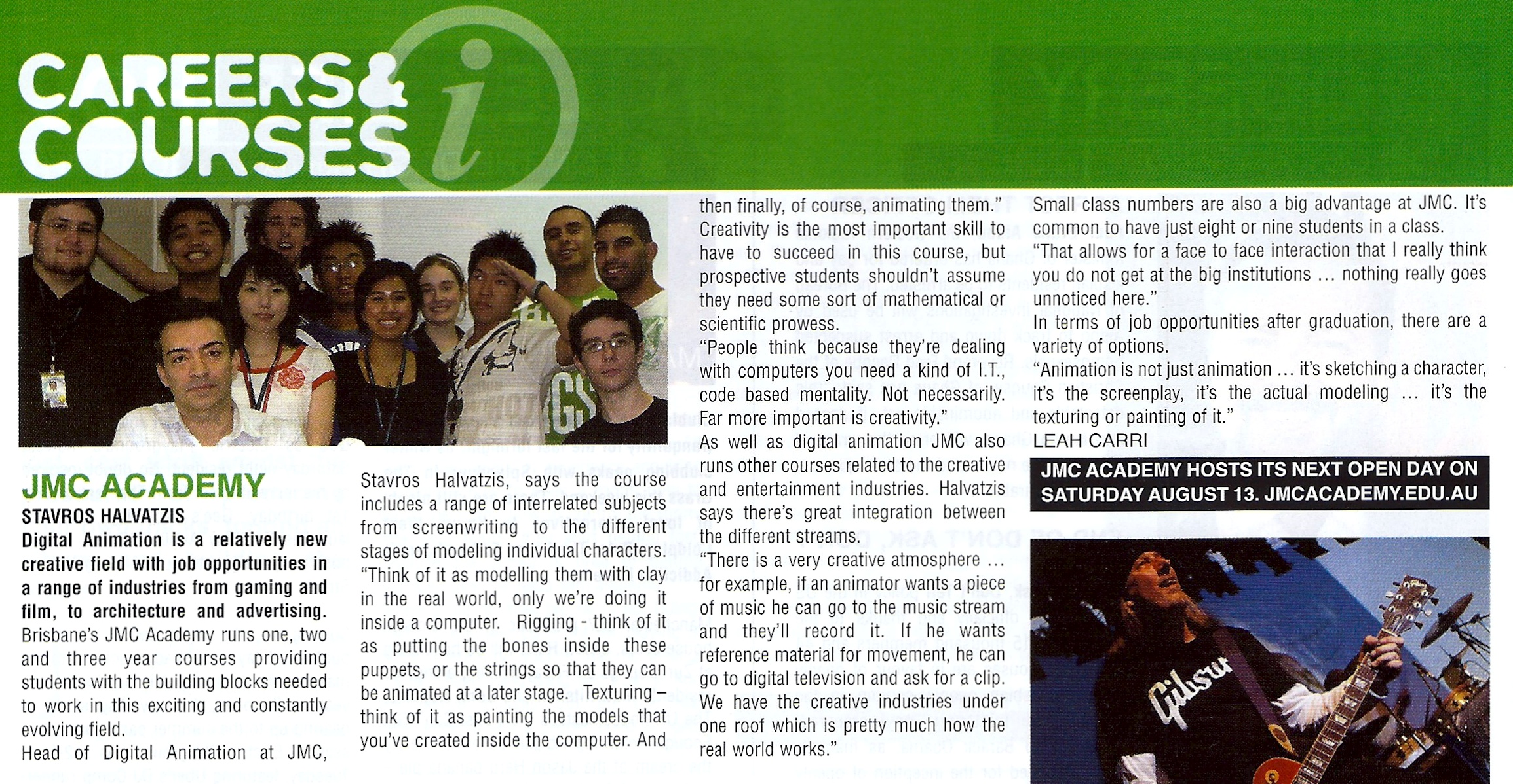 July 28, 2011 Scene Article: JMC Academy – Open Day Interview with Stavros Halvatzis, Head of Digital Animation at JMC Academy, published in Scene Magazine. Share this: Click to share on Facebook (Opens in new window) Facebook Click to share on X (Opens in new window) X Like Loading... Related