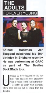August 11, 2011 Scene Article: The Adults – Forever Young Interview with Jon Toogood about his new solo project The Adults, published in Scene Magazine and on Junior Online. Read the full article here or here. Share this: Click to share on Facebook (Opens in new window) Facebook Click to share on X (Opens in new window) X Like Loading... Related