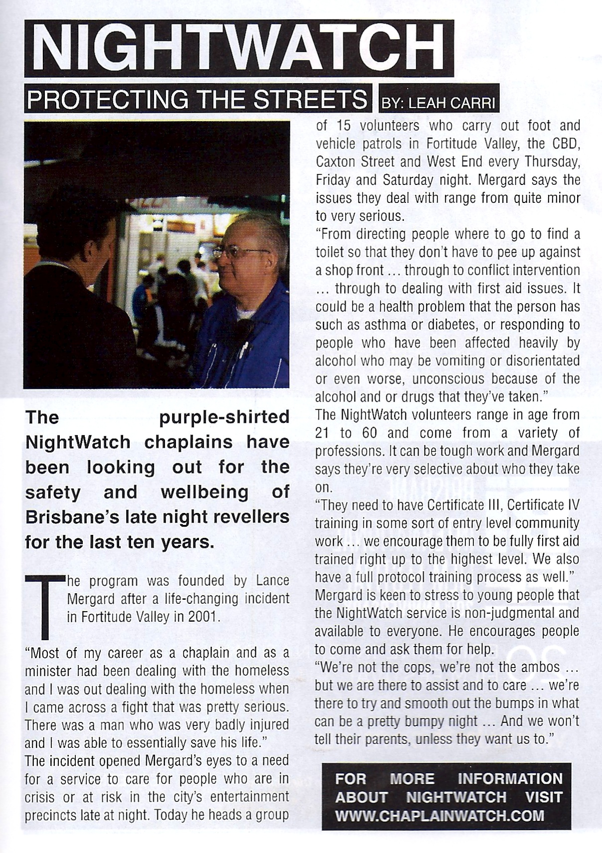 Interview with Nightwatch founder Lance Mergard, published in Scene Magazine.