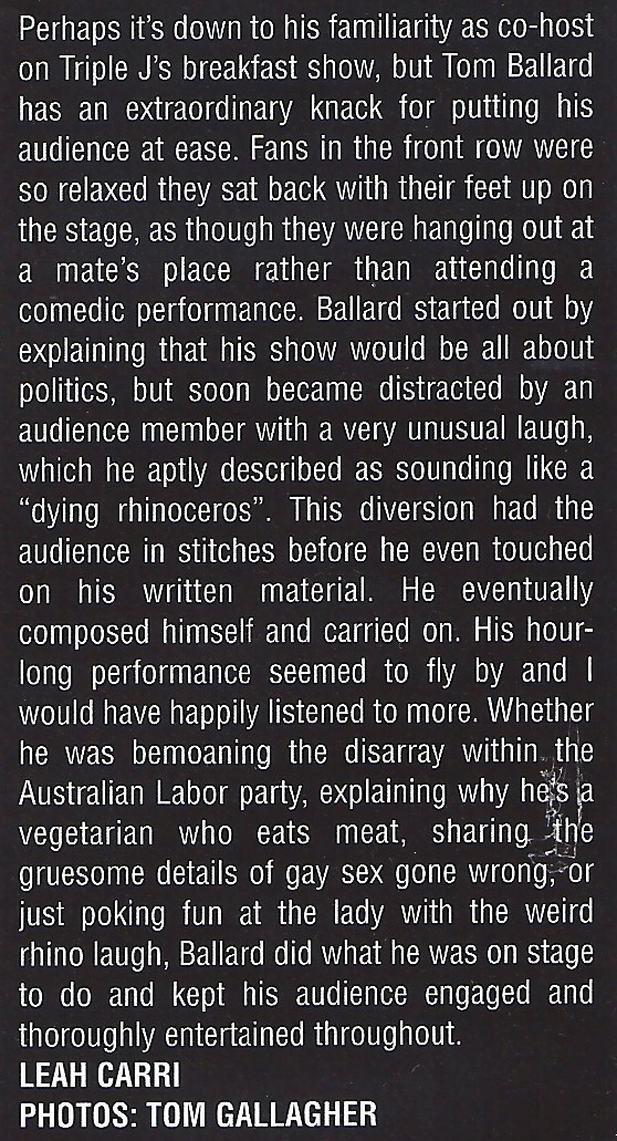 Stand-up comedian Tom Ballard reviewed for Scene Magazine. Click on the image to enlarge. Or read it on Scene’s website here.